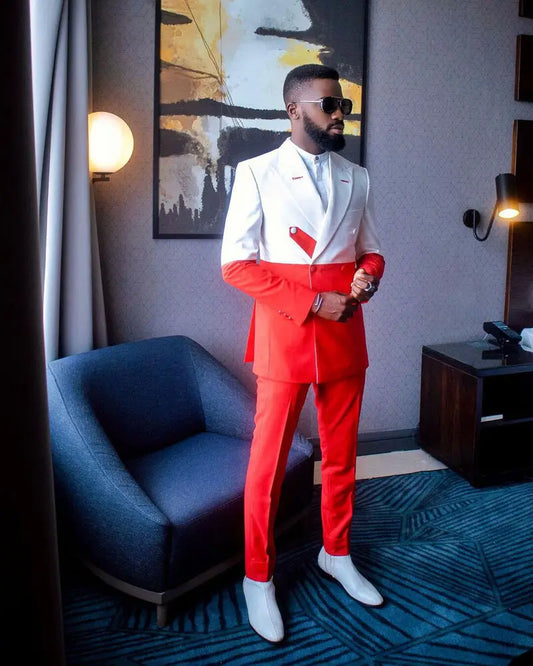 Men's Suits 2 Pieces White Red Splicing Slim Fit Groom Wedding Formal
