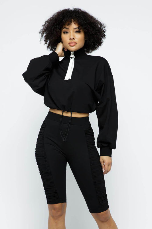 Track Zipper Ruched Jumpsuit Ruffle Dress Bodycon Jumpsuit BLACK